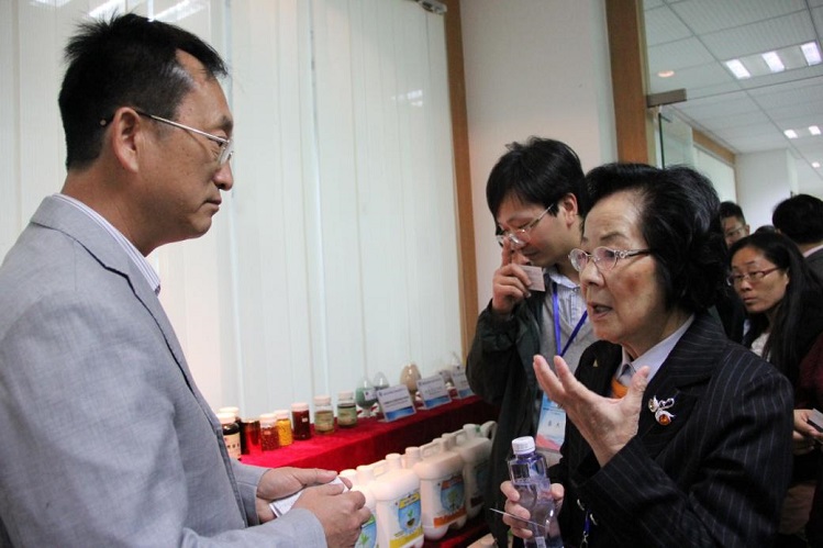 圖為 博泰公司董事長王榮輝向張俐娜院士講解公司的甲殼素產(chǎn)品