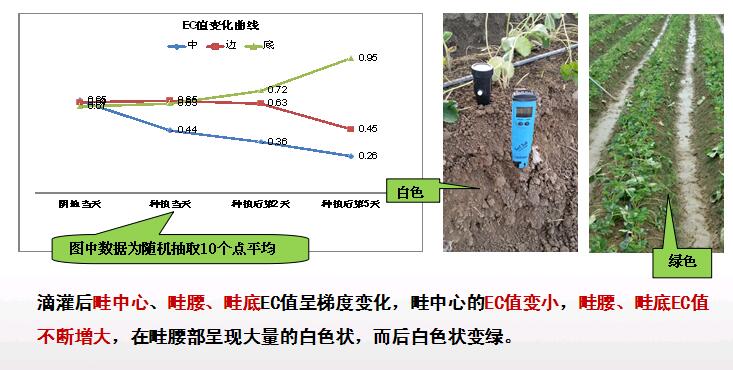 通過EC值不間斷測定,滴灌后種植畦EC值呈梯度式變化,滴灌當(dāng)天,畦中心點(diǎn)EC值為0.65,隨后慢慢降低,5天后降為0.25,潔凈度達(dá)飲用水標(biāo)準(zhǔn)(南寧市自來水EC值為0.28),而畦底的EC值上升為0.95.同時(shí)大量氯鹽和重金屬排出,土壤經(jīng)實(shí)驗(yàn)室化驗(yàn)發(fā)現(xiàn),種植畦內(nèi)、外的土壤氯離子分別為6.9mg/kg和67.97mg/kg,說明大量的氯鹽排出畦外,畦內(nèi)、外的有效鋅含量分別為3.07mg/kg和4.91mg/kg,其它重金屬如鎂、銅也有內(nèi)低外高的差異,說明部分重金屬也被排出。研發(fā)還發(fā)現(xiàn),種植畦底生長的雜草枯黃,有明顯的中毒現(xiàn)象,但種植畦內(nèi)潔凈的土壤確保了草莓苗的生長,成活率達(dá)100%,植株生長健壯。