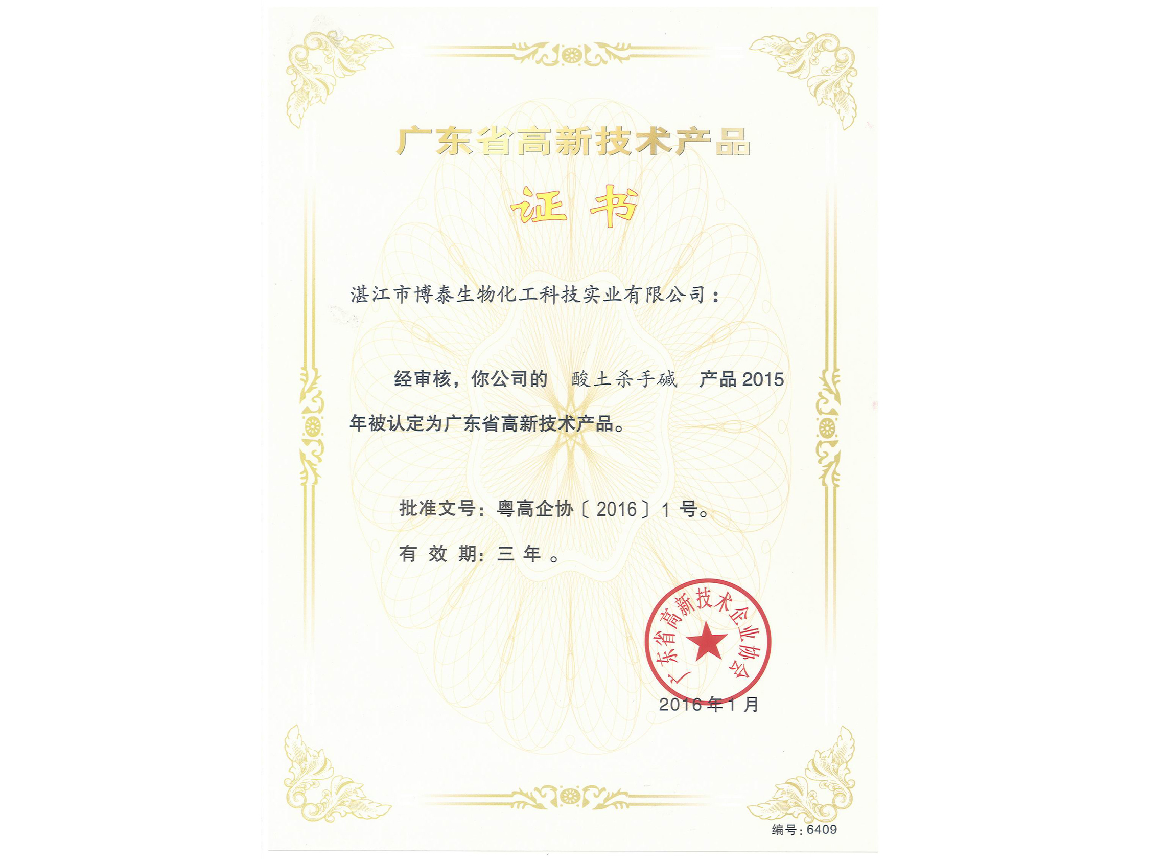 2016年伊始,我司便取得了開門紅,先后獲得由廣東省高新技術(shù)企業(yè)協(xié)會(huì)頒發(fā)的兩個(gè)“廣東省高新技術(shù)產(chǎn)品”證書——“酸土殺手堿”和“蝦肽蝦紅素”。